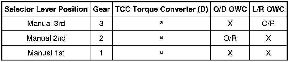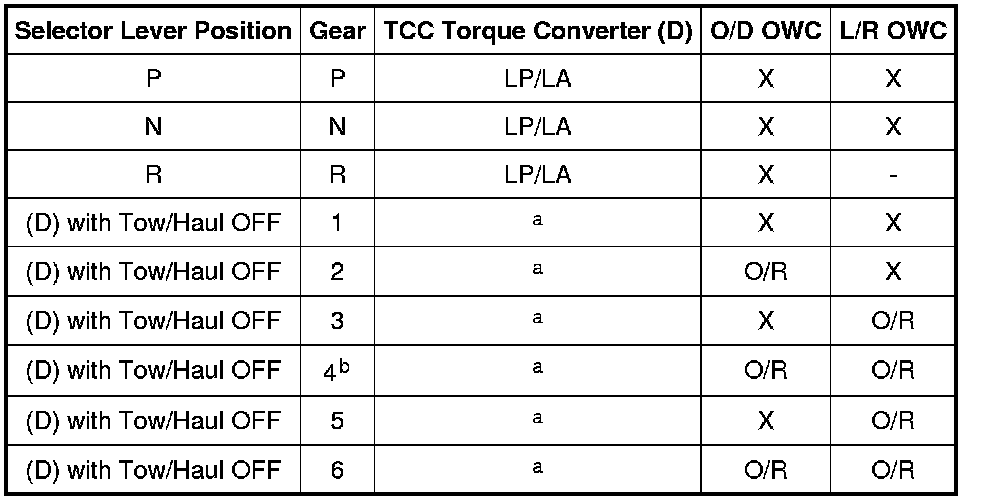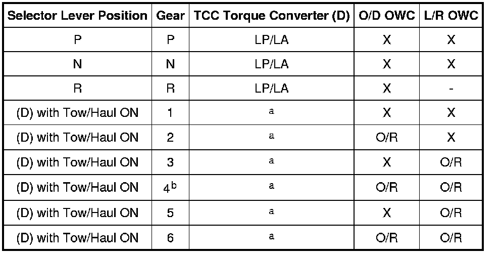 NOTE: The Power Take-Off (PTO) may operate in any gear including PARK and NEUTRAL and does not require the Overdrive (O/D) One-Way Clutch (OWC). The Torque Converter Clutch (TCC) may engage in PARK and NEUTRAL with PTO engaged.