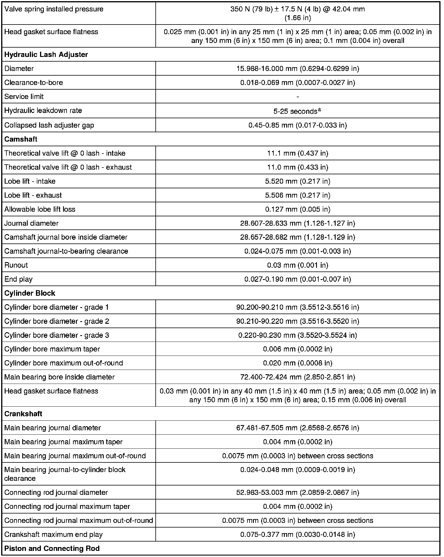 General Specificationsa The time required for the plunger to leak down 1.6 mm (0.062 in) of travel with 222 N force and leak-down fluid in the lash adjuster.