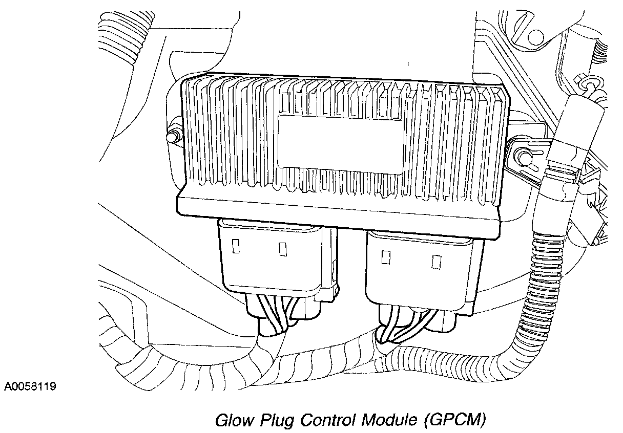 The glow plug system consists of a solid state GPCM, glow plugs, and the associated wiring harnesses. The glow plug on-time is controlled by the PCM and is a function of engine coolant temperature, barometric pressure, and battery voltage. The PCM enables the GPCM to power the individual glow plugs, which it does by providing direct battery voltage. Glow plug on-time normally varies between 1 to 120 seconds. In addition to PCM control, the GPCM internally limits the glow plug operation to 180 seconds regardless of the PCM commanded on-time. The power to the glow plugs is provided through the GPCM solid-state drivers from the vehicle battery. Battery power is fed to the GPCM via two fuses in the power distribution box, then through the vehicle harness (12A581) and the engine harness (12B637), which connects to the GPCM. The GPCM monitors and detects individual glow plug functionality and the control and communication links to the PCM. Concerns detected by the GPCM are transmitted to the PCM using a serial communication signal on a diagnostic line.