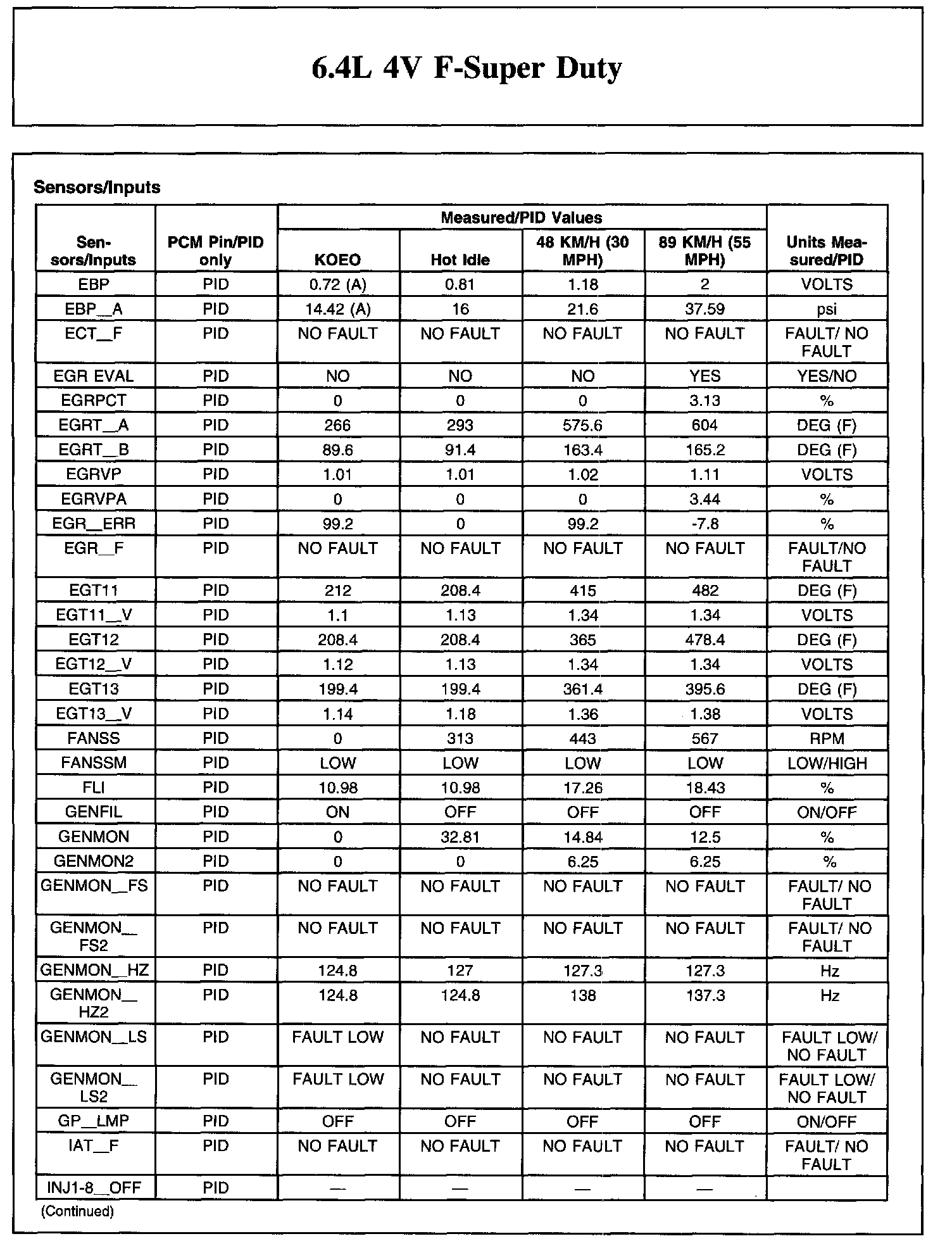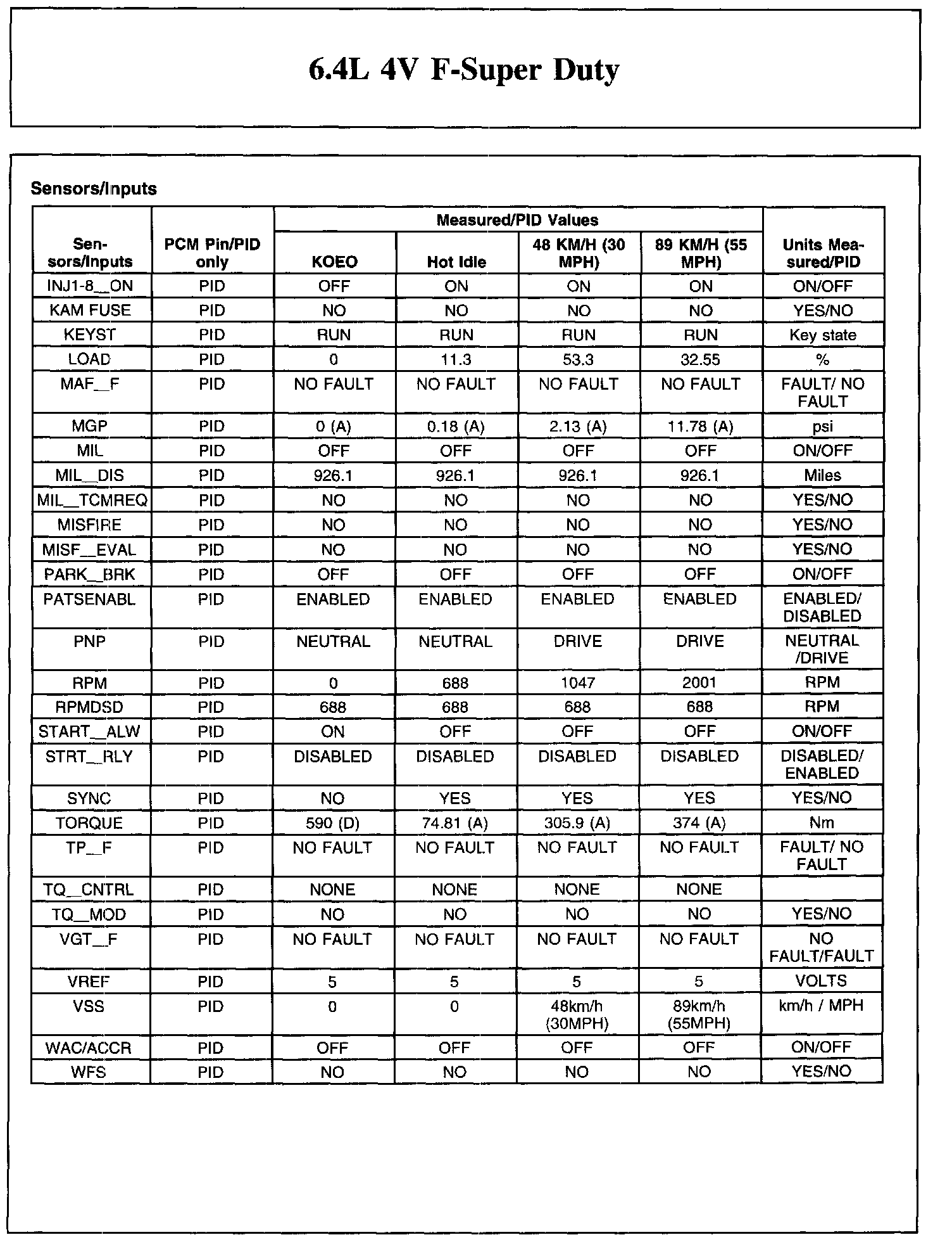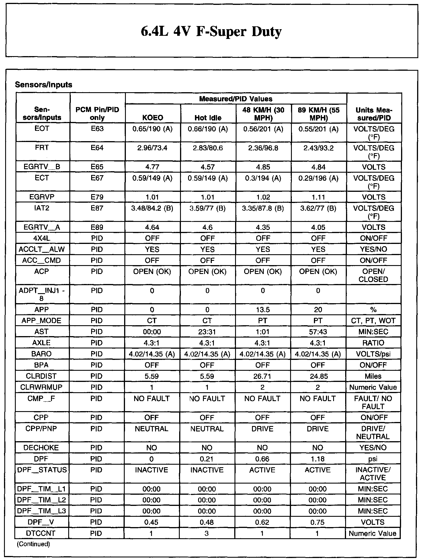 Reference values may vary 20% depending on operating conditions, engine load, temperature, altitude, vehicle speed and other factors. RPM values are axle and tire dependent. Refer to Diagnostic Methods Parameter Identification (PID), for PID descriptions. Parameter Identification (PID)