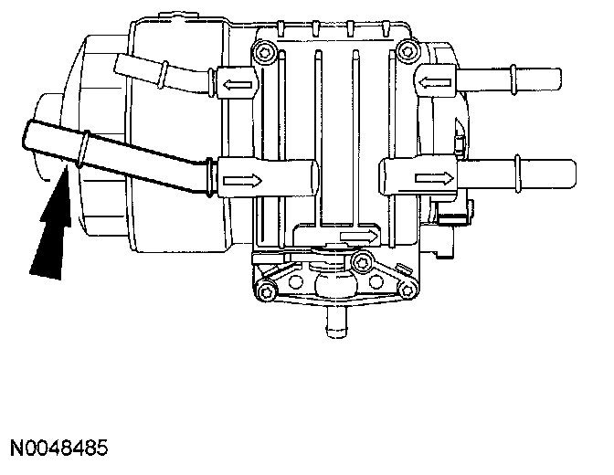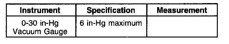 Disconnect the fuel line to the inlet side of the fuel conditioning module. Install the Fuel Line Adapter 310-159 or equivalent and the Vacuum Gauge 0-30 in-Hg vacuum. Measure the restriction at wide open throttle (WOT) (maximum engine speed out of gear with the brakes set and the wheels blocked) If restriction is greater than 6 in-Hg, there is a restriction between the fuel pump and the fuel tank. If the restriction is less than 6 in-Hg, inspect both fuel filters. If the filters are OK, install a new fuel conditioning module. Refer to the Fuel Delivery and Air Induction, Fuel Charging and Controls.
