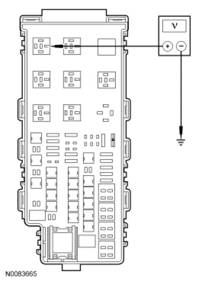 - Measure the voltage between BJB starter motor relay pin 30, circuit SBB10 (YE/RD), harness side and ground.