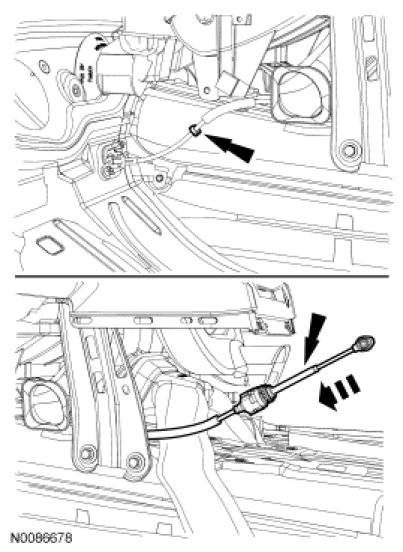4. Route the selector lever cable under the heater housing and connect the selector lever cable retainer to the floor.