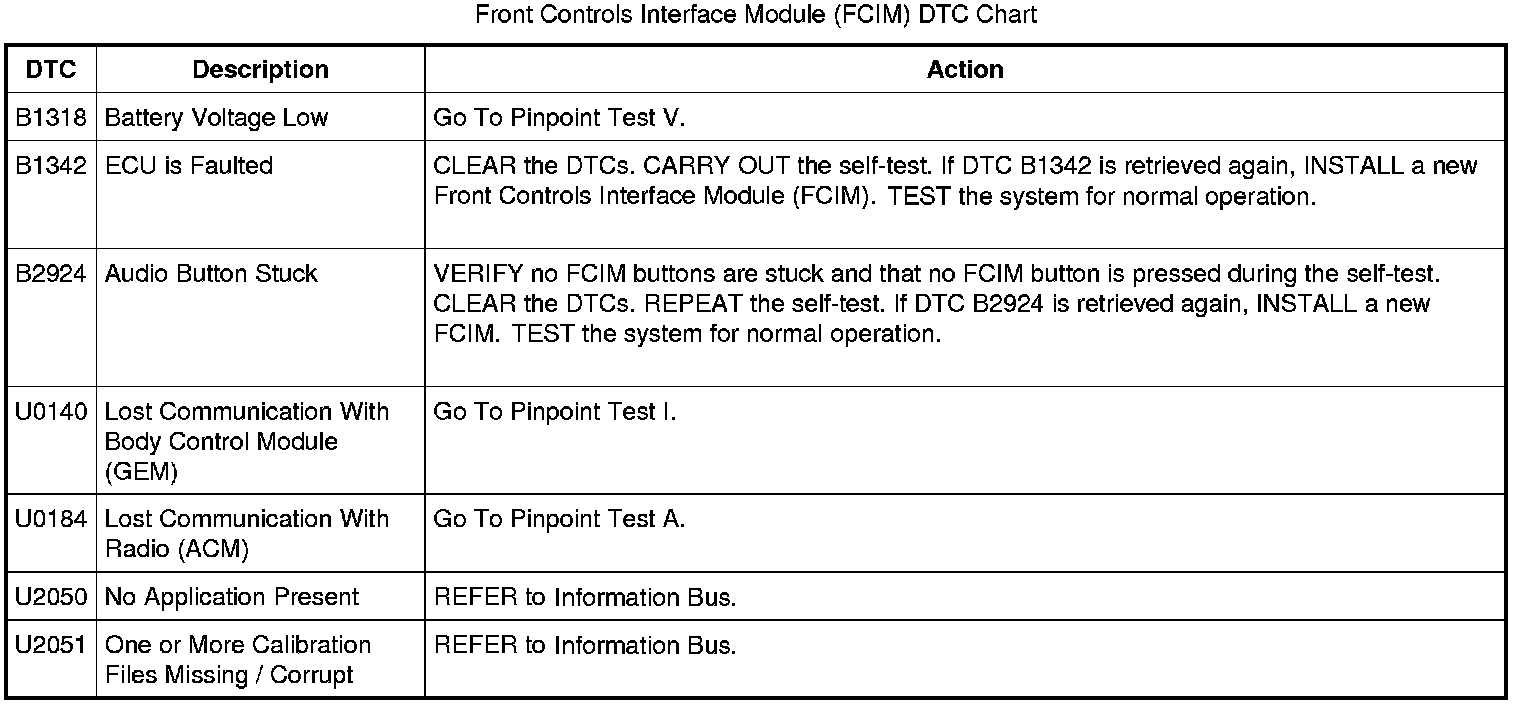 Front Controls Interface Module (FCIM) DTC Chart