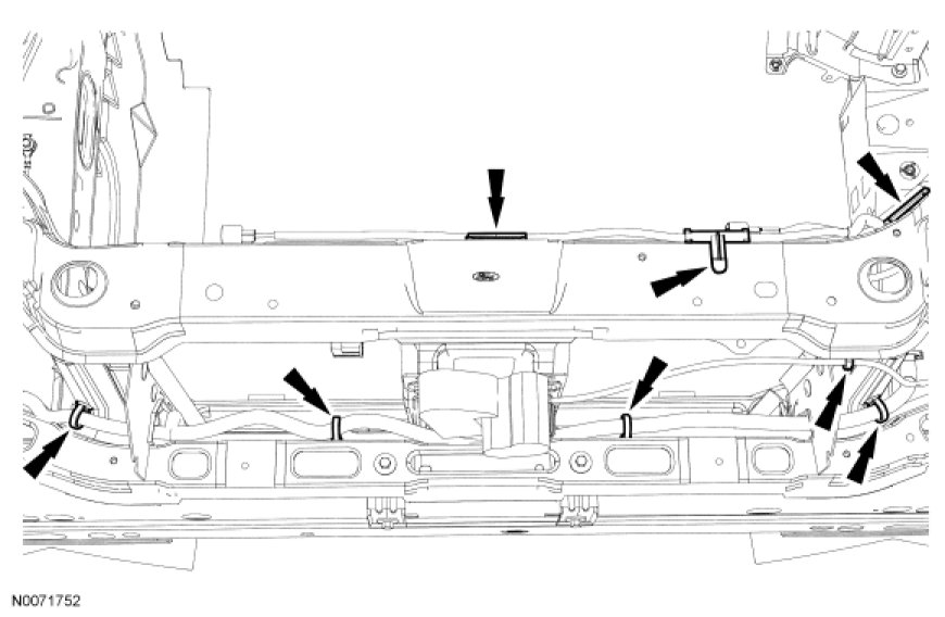 14. With help from an assistant to prevent damaging the wiring harness, remove the radiator grille opening panel reinforcement from the vehicle.