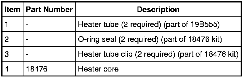 The heater core inlet and outlet tubes can each be separated from the heater core at the joints where they enter the core. The joints are each sealed using an O-ring seal, and are each secured with a clamp. It is not required to install new heater core inlet and outlet tubes when installing a new heater core unless they are damaged or are leaking independently from the core.