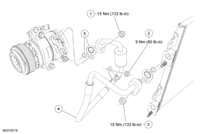 6. Remove the condenser inlet fitting nut and disconnect the fitting.