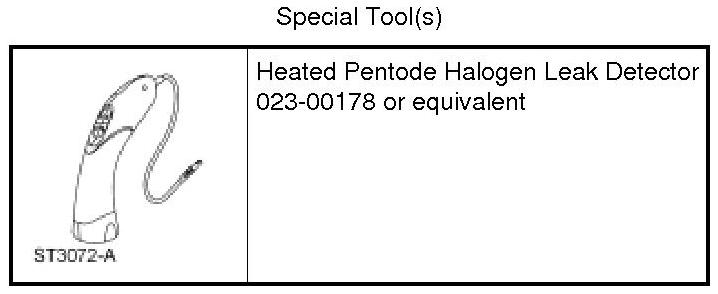 Leak test the refrigerant system using the Heated Pentode Halogen Leak Detector. Follow the instructions included with the Heated Pentode Halogen Leak Detector for handling and operation techniques.