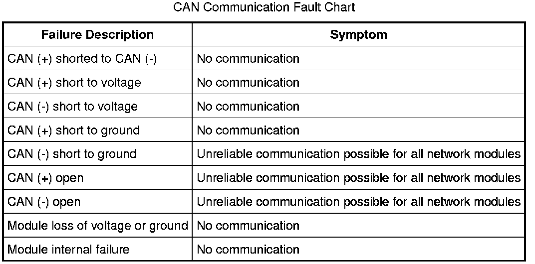 The following fault chart describes the specific CAN failures and their resulting symptom: