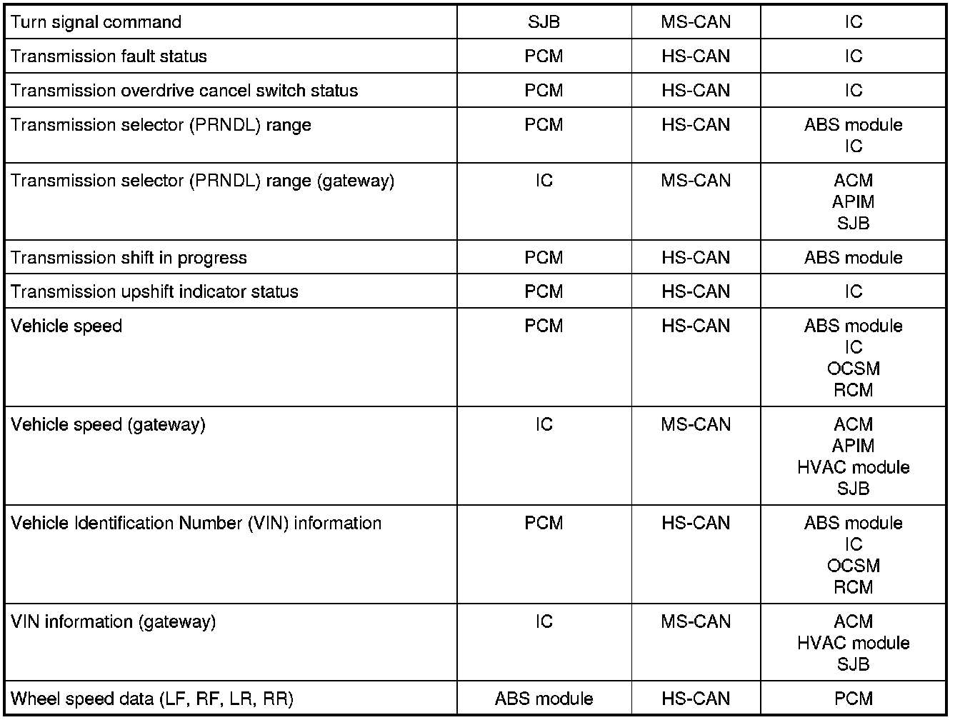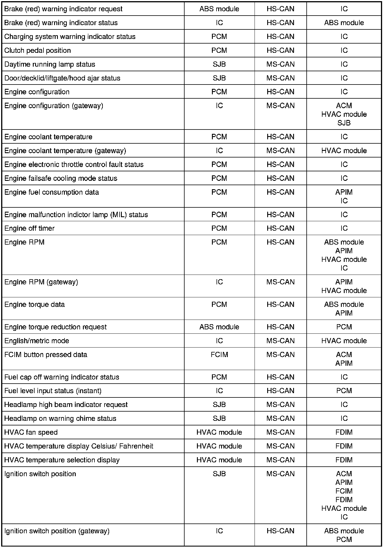 The following chart describes the specific HS-CAN messages broadcast by each module, and the module(s) that receive the message: