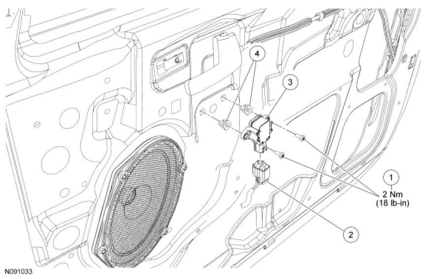 4. NOTICE: To prevent stripping the insert nuts, tighten the side impact sensor bolts only enough to retain the side impact sensor correctly.