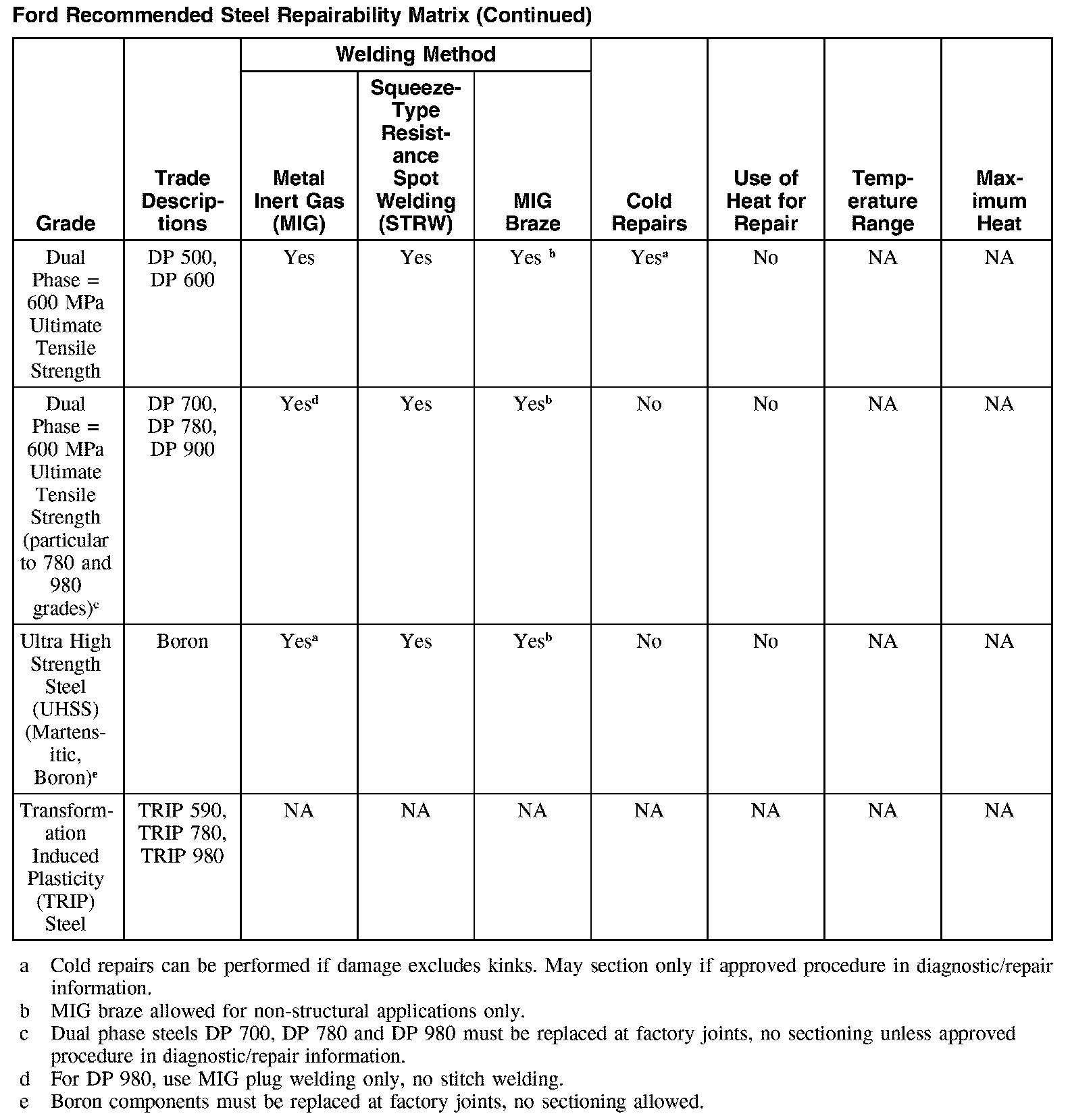 Ford Recommended Steel Repairability Matrix (Part 1):
