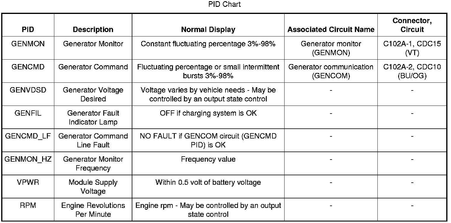 The PIDs and their associated descriptions used in the charging system diagnosis are listed below: