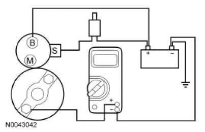 7. Remove the cables from solenoid B-, S- and M-terminals. Clean the cables and connections and reinstall the cables to the correct terminals. Repeat Steps 3 through 6. If the voltage drop reading is still greater than 0.8 volt when checked at the M-terminal and less than 0.8 volt when checked at the B-terminal, the concern is in the solenoid contacts. Install a new starter motor.