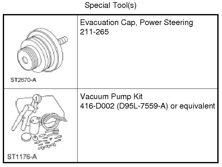 12. Install the Power Steering Evacuation Cap and the Vacuum Pump Kit. Apply and maintain the maximum vacuum of 68-85 kPa (20-25 in-Hg).