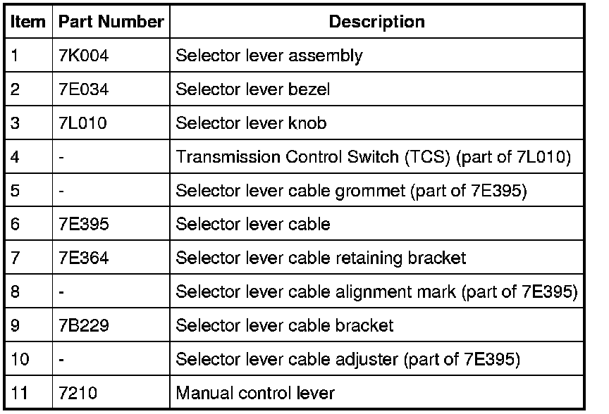 The selector lever controls the transaxle gear selection through the selector lever cable. The cable detent and selector lever locking position is controlled by the selector lever knob.