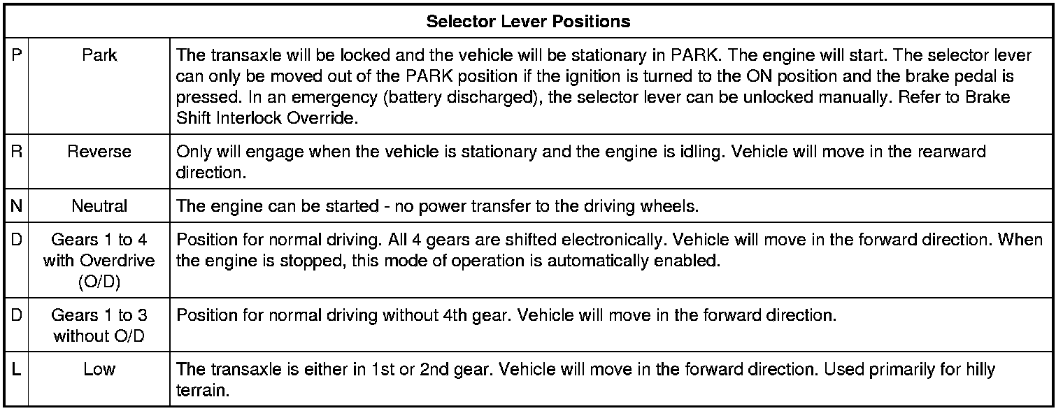 - Allows the driver to move the selector lever from the PARK position, the ignition must be turned to the ON position, brake pedal must be pressed and selector lever release button pressed in.