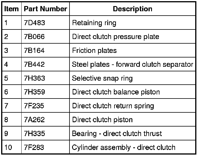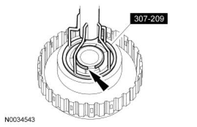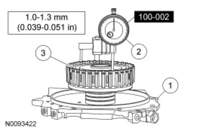 9. Compare the direct clutch pack clearance to the specification (1.0-1.3 mm [0.039-0.051 in]). If the clutch pack clearance is not within specification, select and install the correct size retaining ring to obtain the specified clearance.