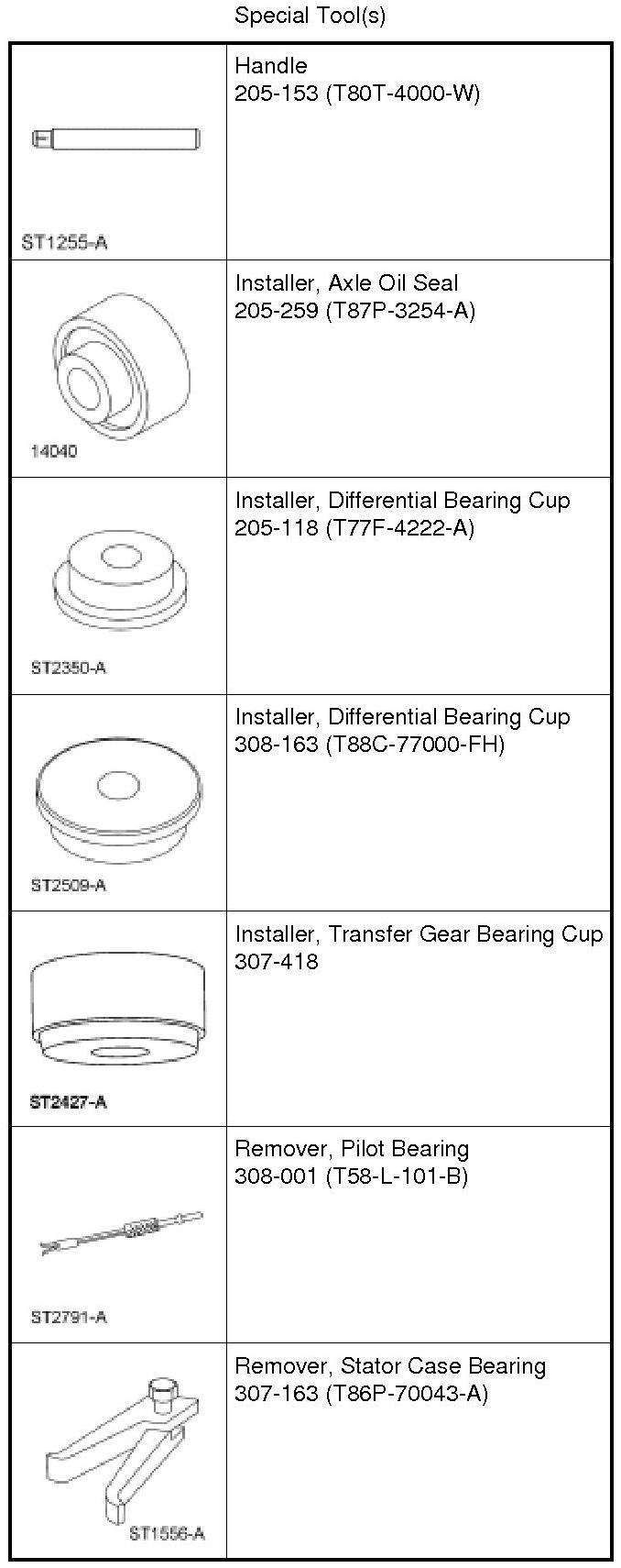 1. NOTE: The converter housing side bearing cups for the transfer shaft bearing and differential case bearing will be installed during the assembly of the transaxle.