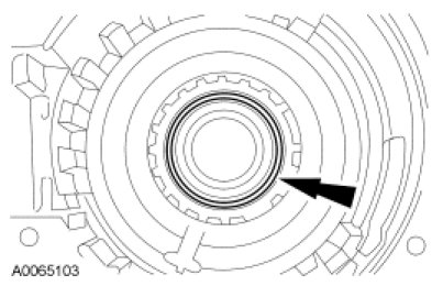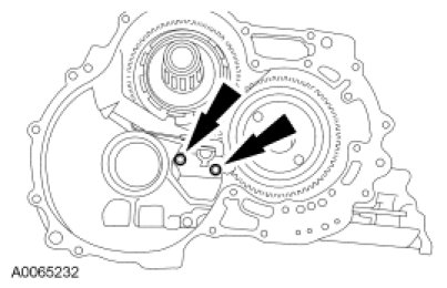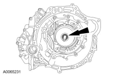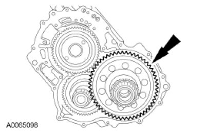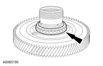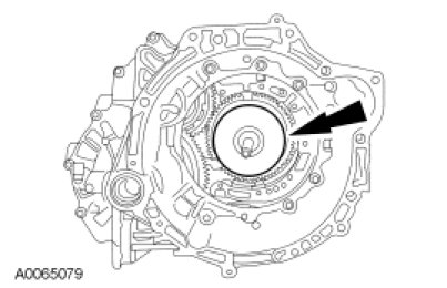 64. NOTICE: Hold the final drive input gear while removing the bearing to prevent it from falling out of the transaxle case or damage to the input gear can occur.