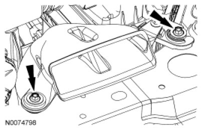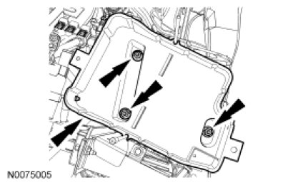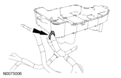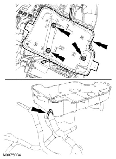 3. Remove the 3 battery tray nuts. Pull the battery tray up, disconnect the wiring harness fasteners from the battery tray and remove the battery tray.