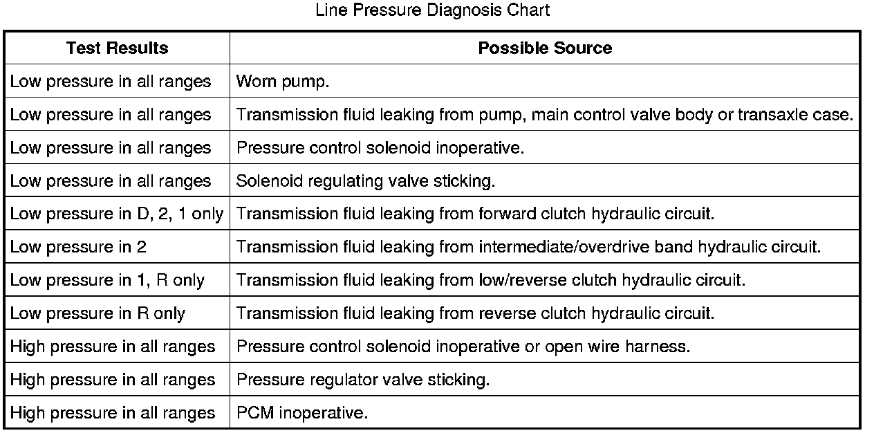 5. If line pressure is not within specification, refer to Line Pressure Diagnosis Chart for line pressure concern causes.