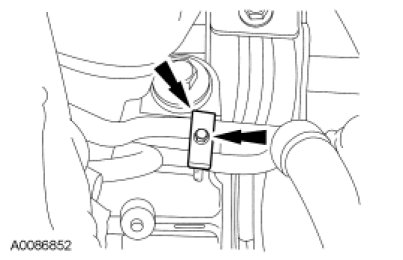 14. Install the engine roll restrictor and the 2 engine roll restrictor bolts.