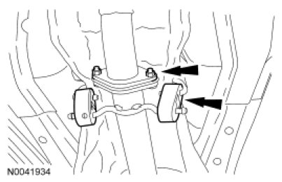 6. Disconnect the center exhaust hanger. Lower the exhaust system and support it with wire.