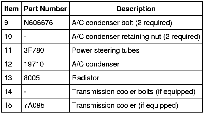 9. Remove the 2 power steering tubes and A/C condenser retaining nuts and position aside the power steering tubes.
