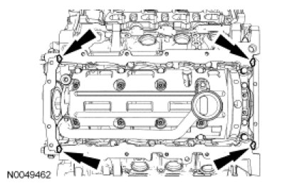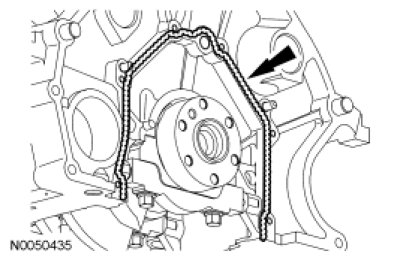 Apply silicone gasket and sealant at the engine front cover-to-cylinder block sealing joints and the crankshaft rear seal retainer plate-to-cylinder block sealing joints.