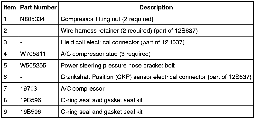 NOTE: A new A/C compressor may come equipped with an A/C clutch disc and hub, A/C compressor pulley and A/C clutch field coil already installed. If these components are not pre-installed, it will be necessary to transfer these parts from the old A/C compressor to the new compressor prior to installations of the A/C compressor if suitable for reuse.