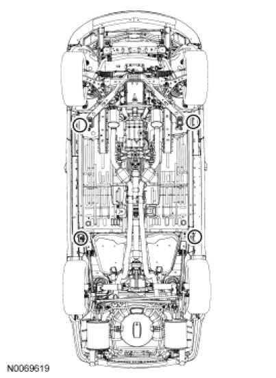 NOTICE: Damage to the suspension, exhaust or steering linkage components may occur if care is not exercised when positioning the hoist adapters prior to lifting the vehicle.
