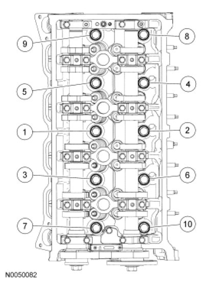 Tighten the new RH cylinder head bolts in 5 stages in the sequence shown.Stage 1: Tighten to 20 Nm (177 lb-in).