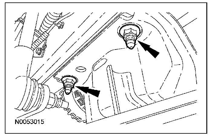 17. NOTE: Using a suitable alignment tool with a 15 mm (0.59 in) OD shaft that is long enough to go through the subframe and body. Align the subframe to the body before tightening the subframe bolts and nuts to specification.