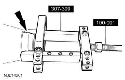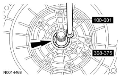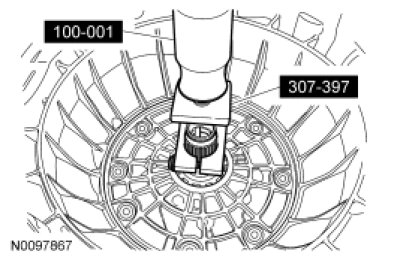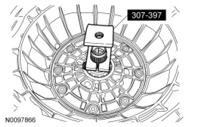 2. WARNING: Secure the torque converter in the transmission during removal or installation. The torque converter is heavy and may result in injury if it falls out of the transmission. Failure to follow this instruction may result in serious personal injury.