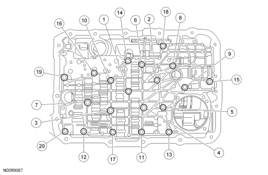 Install the transmission control solenoid body. Tighten the screws in the sequence shown.