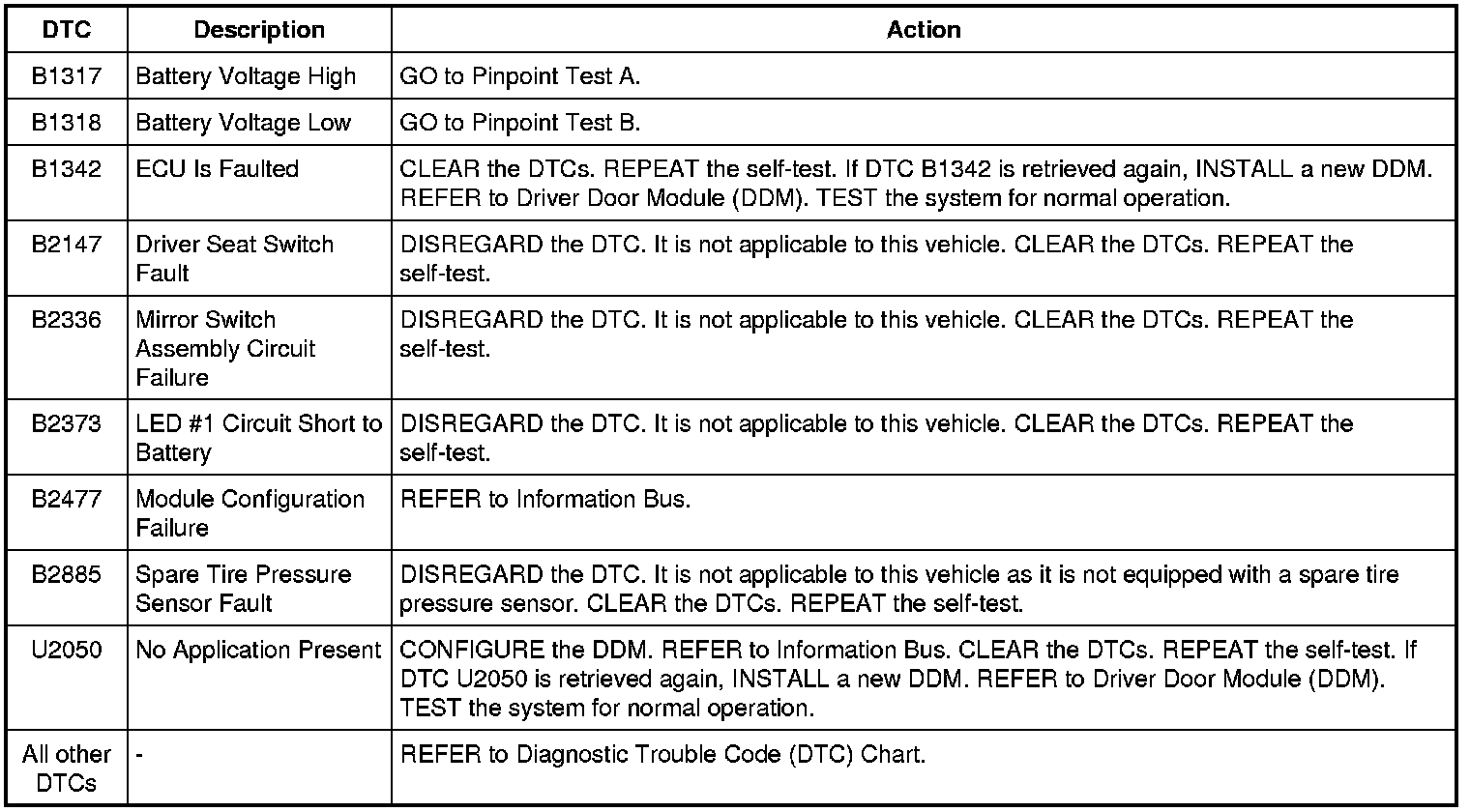 Driver Door Module (DDM) DTC Chart