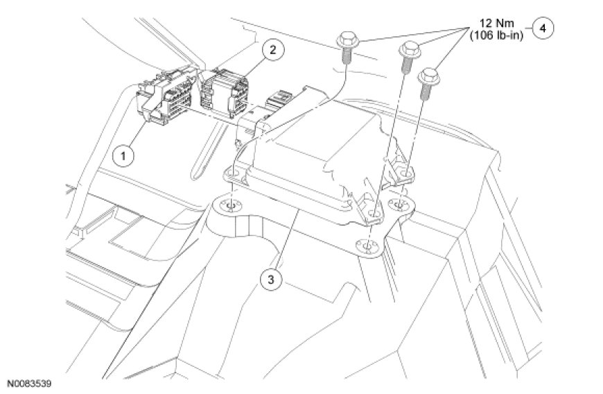 1. WARNING: Always tighten the fasteners of the restraints control module (RCM) and impact sensor (if equipped) to the specified torque. Failure to do so may result in incorrect restraint system operation, which increases the risk of personal injury or death in a crash.