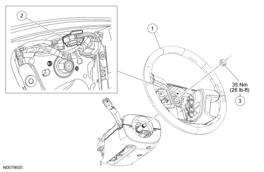 2. Remove the driver air bag module. For additional information, refer to Restraint Systems.