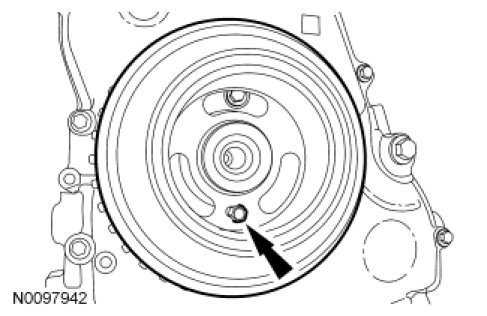 NOTICE: Do not loosen or remove the crankshaft pulley bolt without first installing the special tools as instructed in this procedure. The crankshaft pulley and the crankshaft timing sprocket are not keyed to the crankshaft. The crankshaft, the crankshaft sprocket and the pulley are fitted together by friction, using diamond washers between the flange faces on each part. For that reason, the crankshaft sprocket is also unfastened if the pulley bolt is loosened. Before any repair requiring loosening or removal of the crankshaft pulley bolt, the crankshaft and camshafts must be locked in place by the special service tools, otherwise severe engine damage can occur.