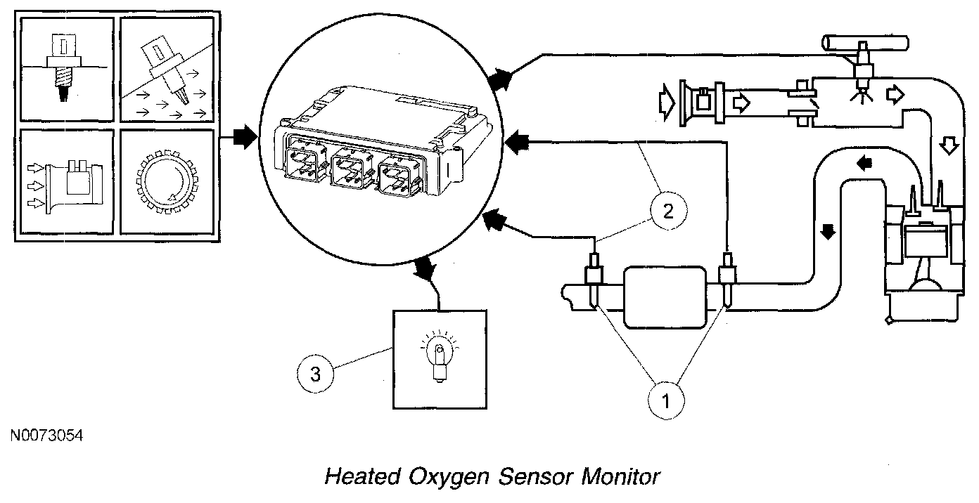 HEATED OXYGEN SENSOR (HO2S) MONITORThe HO2S monitor is an on-board strategy designed to monitor the HO2Ss for concerns or deterioration which can affect emissions. The front or stream 1 HO2S is checked for correct output voltage and response rate. Response rate is the time it takes to switch from lean to rich or rich to lean. The rear or stream 2 HO2S is monitored for correct output voltage and is used for catalyst monitoring and fore-aft oxygen sensor (FAOS) control. Input is required from the cylinder head temperature (CHT), intake air temperature (IAT), mass air flow (MAF) and crankshaft position (CKP) sensors to activate the HO2S monitor. The fuel system monitor and misfire detection monitor must also complete successfully before the HO2S monitor is enabled.
