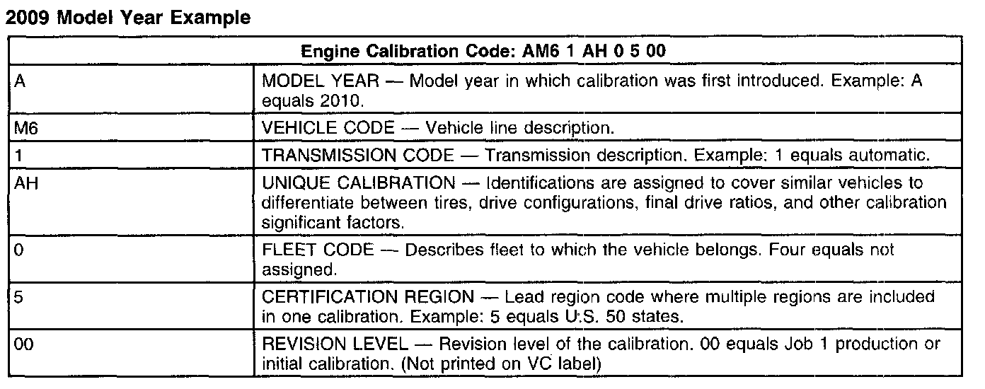 Base engine calibration information, also referred to as the powertrain calibration, is located in the lower right corner of the VC label. Engine calibration information is limited to a maximum of five characters per line (two lines maximum). Calibration information more than five characters long wraps to the second line of this field. Only the base calibration appears on this label. The revision level is no longer printed on the label; however, it can be found in On-line Automotive Service Information System (OASIS). For more information on VC label or engine calibration, refer to the Vehicle/Application and ID, Identification Codes.