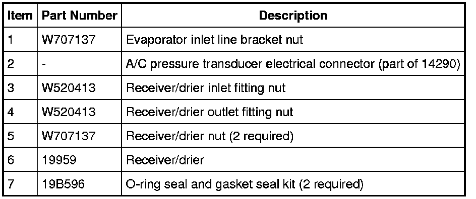 NOTE: Installation of a new receiver/drier is not required when repairing the A/C system, except when there is physical evidence of contamination from a failed A/C compressor or damage to the receiver/drier. Damage to the receiver/drier includes leaks, physical damage to the receiver/drier shell or desiccant, or moisture contamination. Moisture contamination results only from a complete loss of refrigerant, and equalization of the refrigerant system pressure with atmospheric pressure for a period longer than one hour. If even a slight amount of positive refrigerant pressure is present in the refrigerant system before repairs are carried out, a new receiver/drier should not be installed.