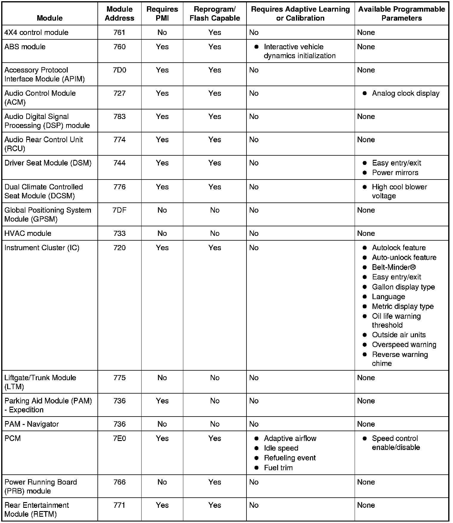 PMI is a scan tool process which configures settings in a new module. Data used for the PMI process is automatically downloaded from the original module and stored when a scan tool session is started. If this data cannot be retrieved from the module being replaced, the scan tool may prompt for As-Built data entry or display a list of parameter values that need to be manually selected. Some modules are reprogrammed during PMI when a later strategy/calibration update is available. To carry out PMI, refer to Programmable Module Installation (PMI) Programmable Module Installation (PMI).