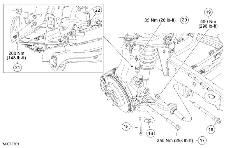 - To install the new lower arm rearward flag bolt and nut, tighten to 200 Nm (148 lb-ft).