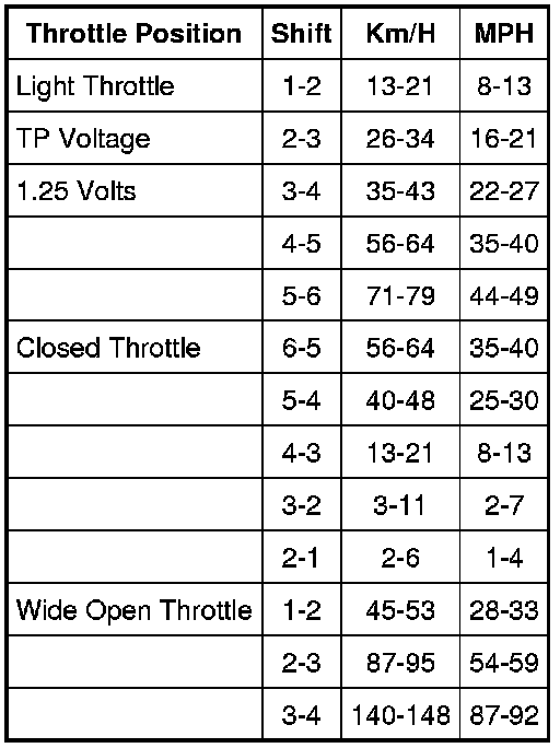 NOTE: Shift speed ranges are approximate for all applications. For specific applications (engine, axle ratio, tire size and application), refer to the Automatic Transmission Specification booklet. Always drive the vehicle in a safe manner according to driving conditions and obey all traffic laws.