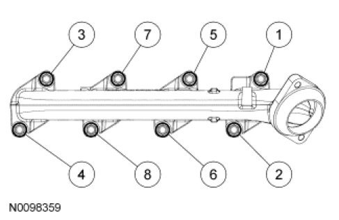 Using new exhaust manifold nuts, install the 8 nuts in 2 stages in the sequence shown.