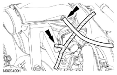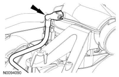 2. Disconnect the crankcase vent tube quick connect coupling from the ACL outlet pipe-to-Throttle Body (TB) adapter. For additional information, refer to Fuel Delivery and Air Induction.
