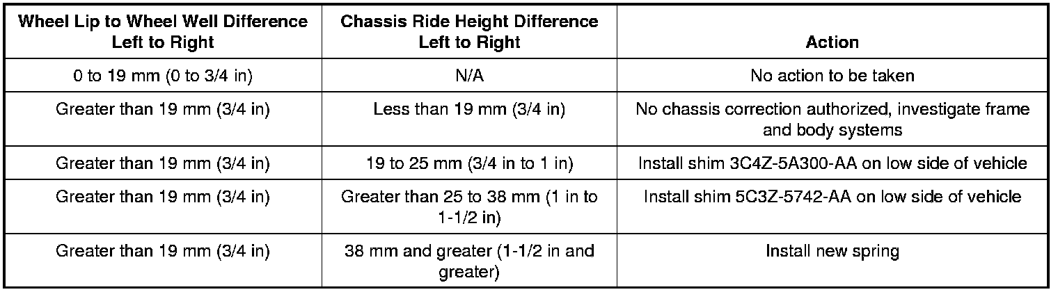 14. Using the recorded wheel well difference numbers, the recorded chassis ride height difference numbers and the following repair action chart, determine what repair action is needed to correct the vehicle lean condition.