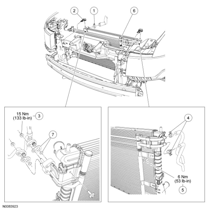 10. Release the 2 transmission cooler line clamps and disconnect the lines from the condenser core.